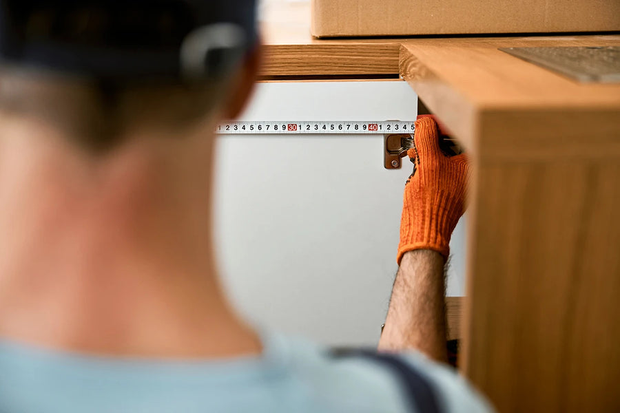 Použijte metr a změřte šířku × výšku každého dvířka v milimetrech. Měřte čelní plochu, ne vnitřek skříňky.